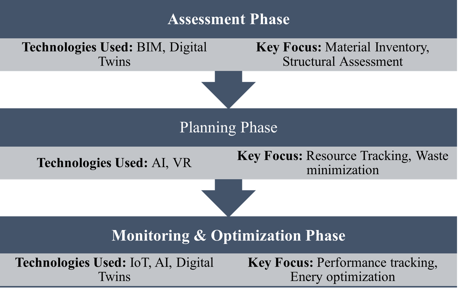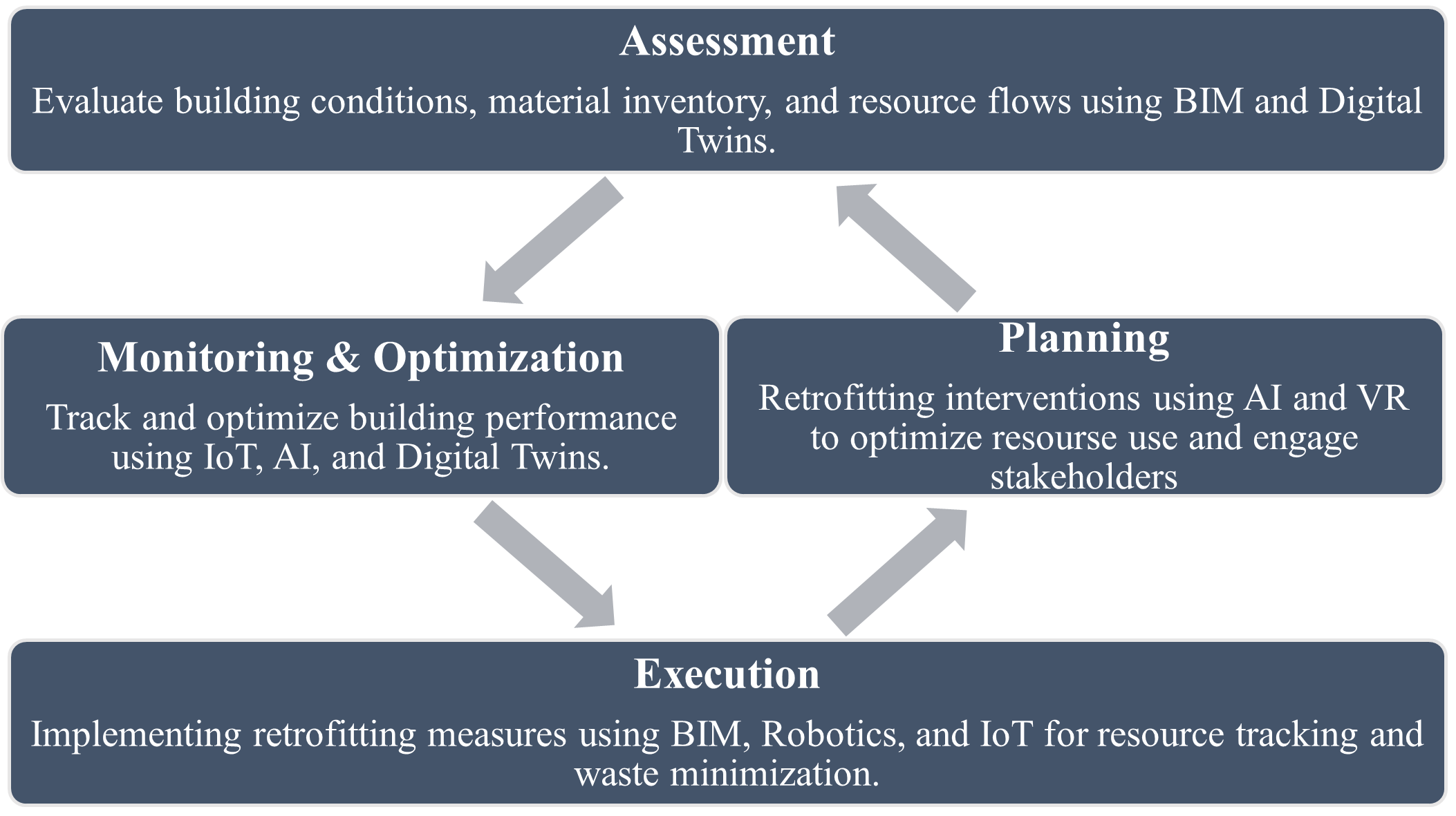 Over one-third of the world’s final energy consumption and a considerable fraction of greenhouse gas emissions are tied to the built environment [1], [2]. Alongside these energy demands, the construction sector is also responsible for extensive resource extraction and material waste, as traditional linear processes (extract → build → demolish) fail to recover significant value at a building’s end of life [3], [4]. The Circular Economy (CE) has gained attention as a means to mitigate these impacts, urging the industry to close resource loops through reusing, recycling, and extending the lifespan of building materials [5], [6], [7]. While CE adoption in new construction has steadily advanced, existing buildings—which constitute the majority of the built environment—pose additional complexities [8], [9], [10]. Retrofitting can entail dealing with heterogeneous building conditions, outdated structural designs, hazardous materials, and stakeholders with varying priorities. These realities make it harder to standardize or systematize circular strategies. Recent years have seen a rapid digital transformation, with tools like Building Information Modeling (BIM), the Internet of Things (IoT), Artificial Intelligence (AI), and Digital Twins offering new ways to plan, execute, and monitor CE interventions [11], [12], [13], [14]. Yet many research efforts focus on individual technologies or on newly built, “greenfield” projects [15], [16], [17], [18]. As a result, there is a need for an integrated framework that assembles multiple digital solutions into a cohesive lifecycle for retrofits, addressing the practical barriers of cost, regulation, data sharing, and stakeholder misalignment. Accordingly, this paper proposes a four-phase strategy—covering Assessment, Planning, Execution, and Monitoring & Optimization—and explains how each digital tool supports CE objectives at each stage. In doing so, the paper aims to answer the following overarching questions: • How can digital technologies be leveraged to systematically enhance circular outcomes in retrofitting existing buildings? • What are the critical barriers to adoption, and how does a phased approach help practitioners overcome them? • Which benefits—material reuse, lower energy consumption, better occupant experience—are most attainable, and what constraints remain? Addressing these questions will establish a roadmap that enables policymakers, industry professionals, and researchers to integrate Circular Economy principles into a sector traditionally characterized by linear processes. ## 2. Literature Review ### 2.1 Circular Economy in Construction The CE model emphasizes minimizing raw material use, reducing and recirculating waste, and designing “closed loops” where end-of-life building components can be transformed into new resources [5], [6], [7]. In the construction industry, these principles translate into design for disassembly, prioritizing secondary materials, and adopting lifecycle assessments to gauge total environmental footprints [6], [7]. Despite clear theoretical benefits—such as reduced landfill burdens and lower embodied carbon—practical application in existing buildings lags behind. Older structures are often saddled with unforeseen costs, especially if hazardous materials (like asbestos) must be carefully removed or if certain structural elements cannot be easily reused [8], [9]. Variability in building codes across jurisdictions can further hamper the large-scale application of CE principles, particularly in retrofits that necessitate creative technical solutions or partial demolition [10]. ### 2.2 Digital Technologies as Enablers Technological advancements in construction informatics have opened new frontiers for implementing CE: • BIM (Building Information Modeling): Provides detailed data about building components, enabling more accurate material inventories, clash detection, and waste minimization strategies [19], [20]. • IoT (Internet of Things): Deployed sensors can track energy and resource use in real time, informing data-driven strategies for occupant comfort and resource optimization [21]. • AI (Artificial Intelligence): Machine learning algorithms support predictive analyses—e.g., identifying cost-effective retrofit options or anticipating component failure [22]. • Digital Twins: Virtual replicas of physical assets that allow simulation-based testing, real-time performance evaluation, and scenario planning to adapt to occupant changes or new policy environments [13], [23]. Although each tool has proven its value in discrete contexts (e.g., BIM for new builds or IoT for smart offices), few frameworks combine these digital technologies seamlessly across the full retrofit lifecycle, which often involves partial demolition, reconfiguration, or occupant relocation [15], [16], [17], [18]. ### 2.3 Gaps in Existing Frameworks Studies focusing on digital solutions for retrofits frequently address either energy performance or material reuse but seldom adopt a holistic lens [16], [18]. Interoperability challenges also arise, as data generated by different tools (BIM vs. IoT) may lack compatible formats [17]. Meanwhile, smaller construction firms find it difficult to shoulder the training costs required for advanced digital solutions [8], [9], [17]. In this context, a unified model is needed—one that prescribes how digital technologies can support specific CE outcomes (e.g., resource recovery, waste reduction) at each stage of an existing building’s life. ## 3. Methodology ### 3.1 Literature Review Approach This study synthesized findings from over 80 peer-reviewed articles and reports retrieved from Scopus, Web of Science, and IEEE Xplore using search terms like “circular economy,” “building retrofit,” “BIM and demolition waste,” and “IoT-based energy management.” Screening criteria included a direct focus on either retrofits or digital solutions for the const