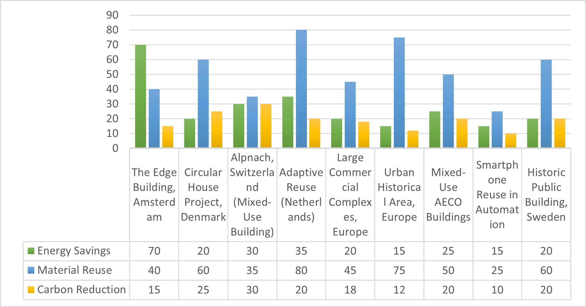 • Performance Metrics: Quantitative data were gathered on key indicators such as energy savings, material reuse, and waste reduction.